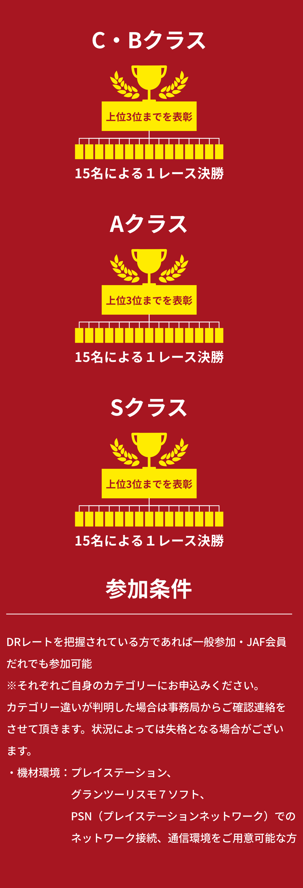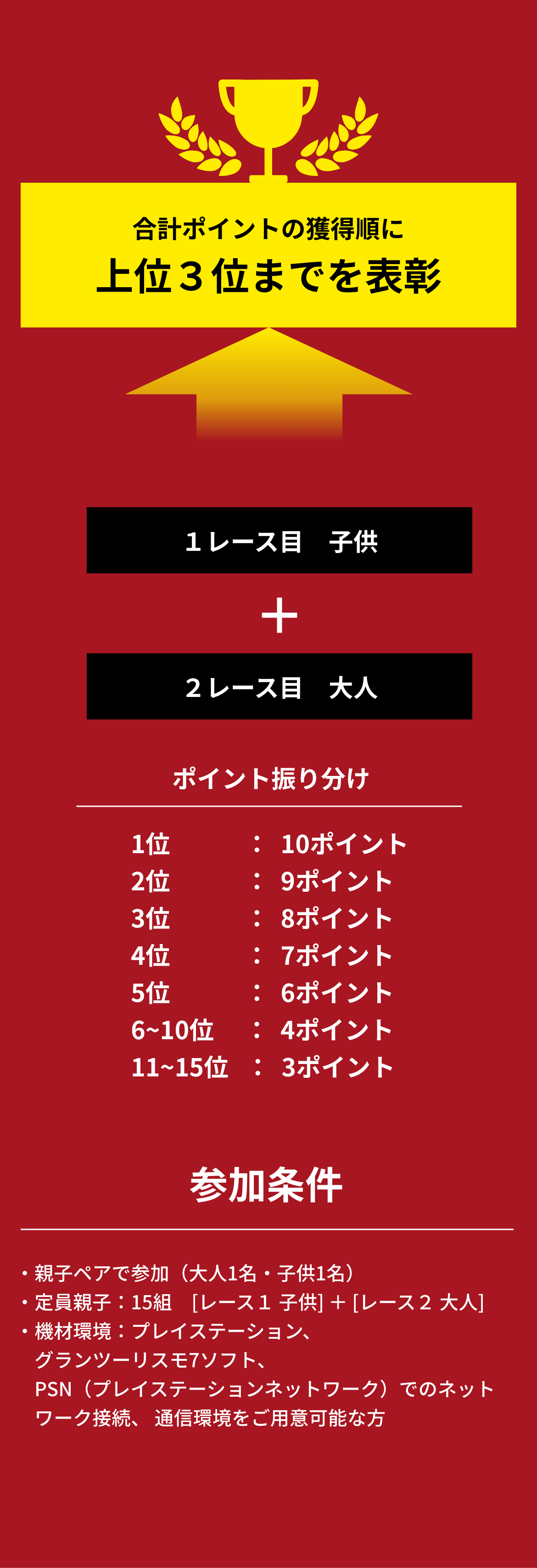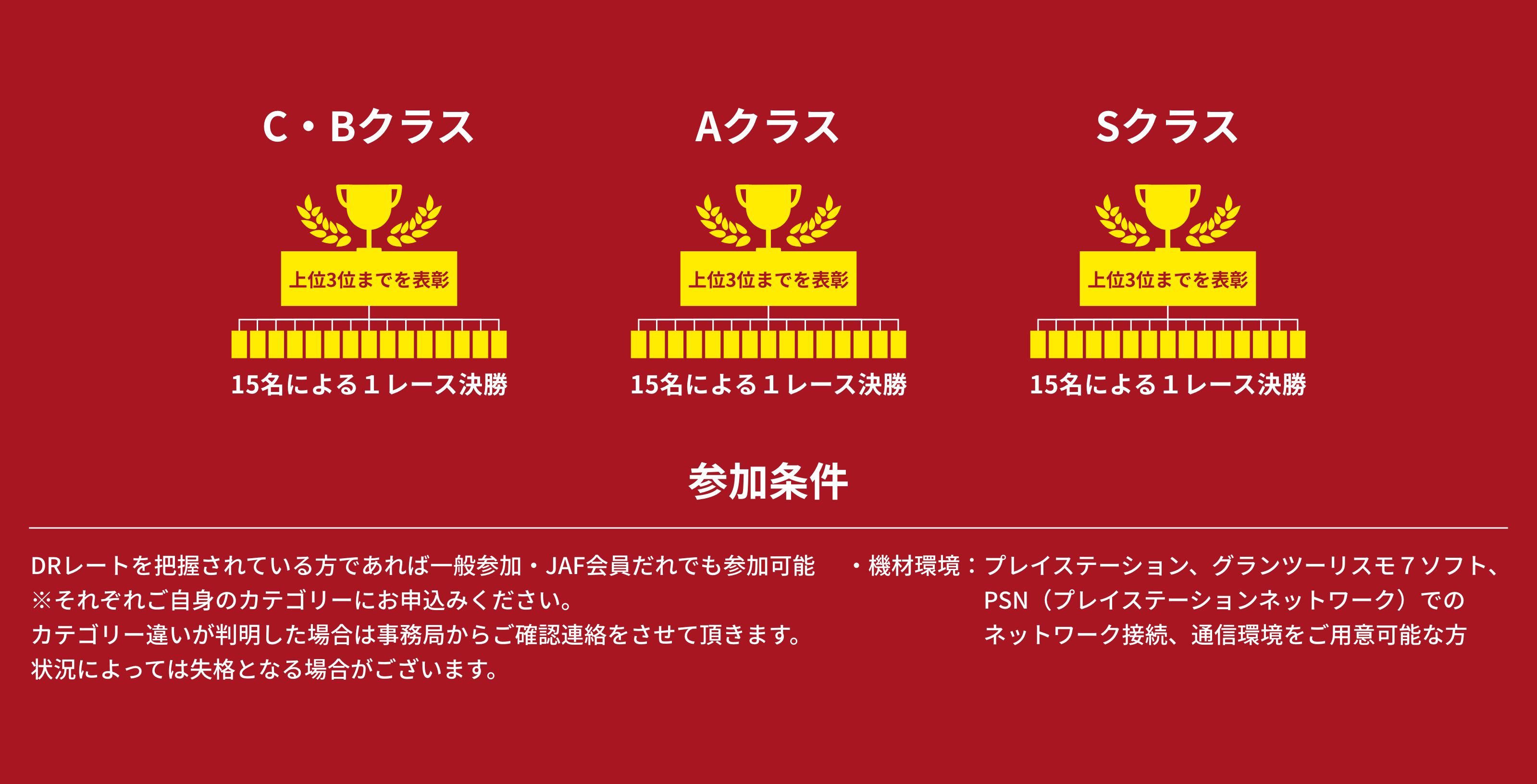 参加者カテゴリーとして「経験者部門」・「中学生以下部門」の2カテゴリーを用意。それぞれ6名づつによる予選・準決勝・決勝と勝ち上がりいただきます。大会中はプロの実況者がレース実況しながら解説と会場を盛り上げを致します。各レースの優勝者様にはファステストラップを記載したタイム証をプレゼント。