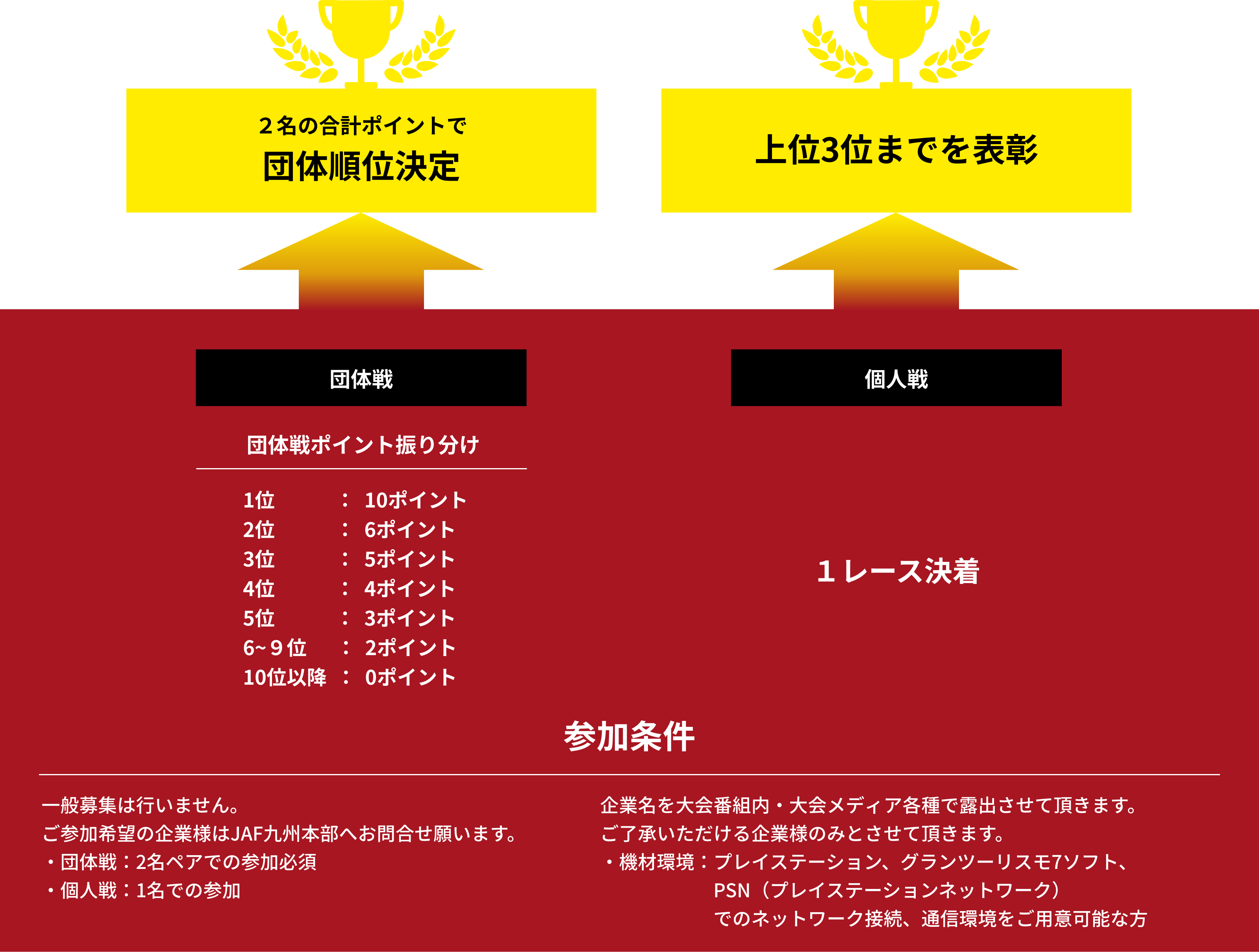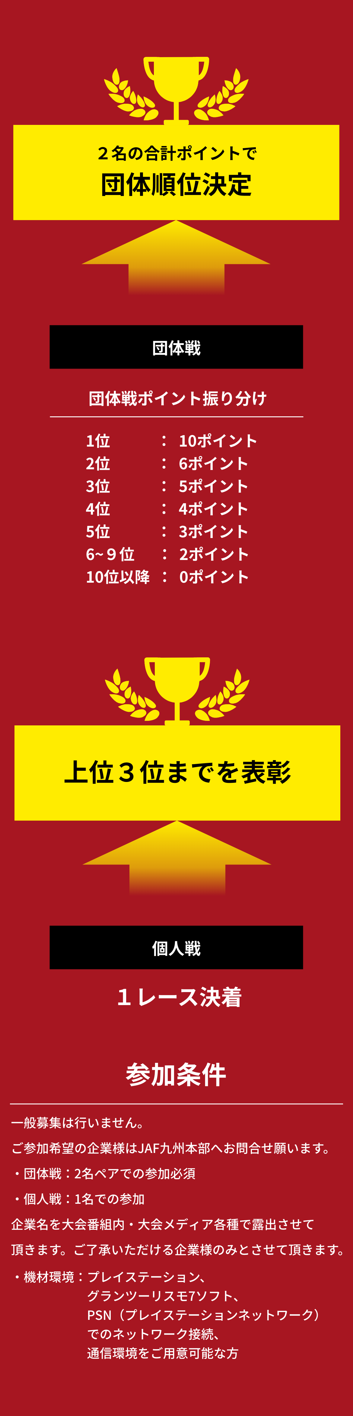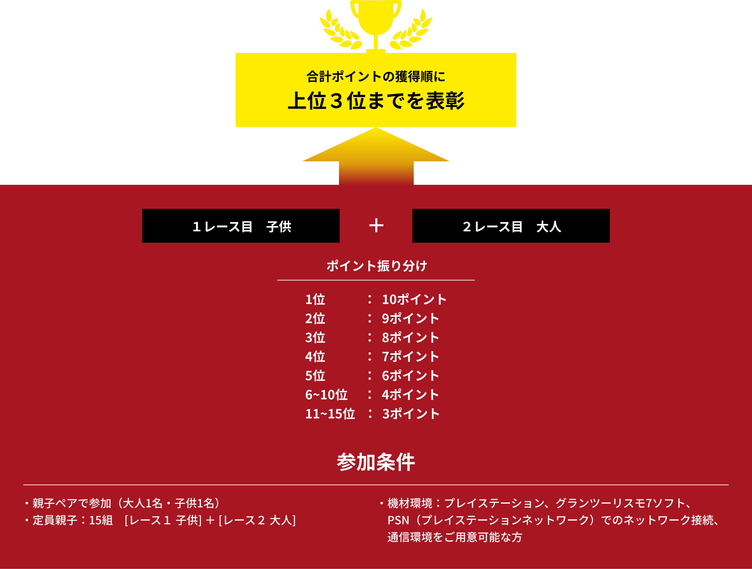 参加者カテゴリーとして「経験者部門」・「中学生以下部門」の2カテゴリーを用意。それぞれ6名づつによる予選・準決勝・決勝と勝ち上がりいただきます。大会中はプロの実況者がレース実況しながら解説と会場を盛り上げを致します。各レースの優勝者様にはファステストラップを記載したタイム証をプレゼント。